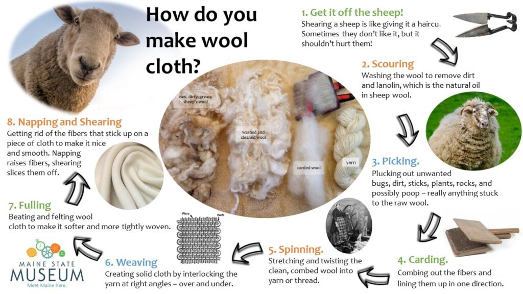Wool production in Maine has been around for centuries. Since the 1780s and even earlier, farmers in Maine and New England have been processing raw wool into usable textiles. Wool is a natural fiber that comes from sheep. By the 1840’s, water powered textile mills and factories were producing a wide, affordable variety of textile products.