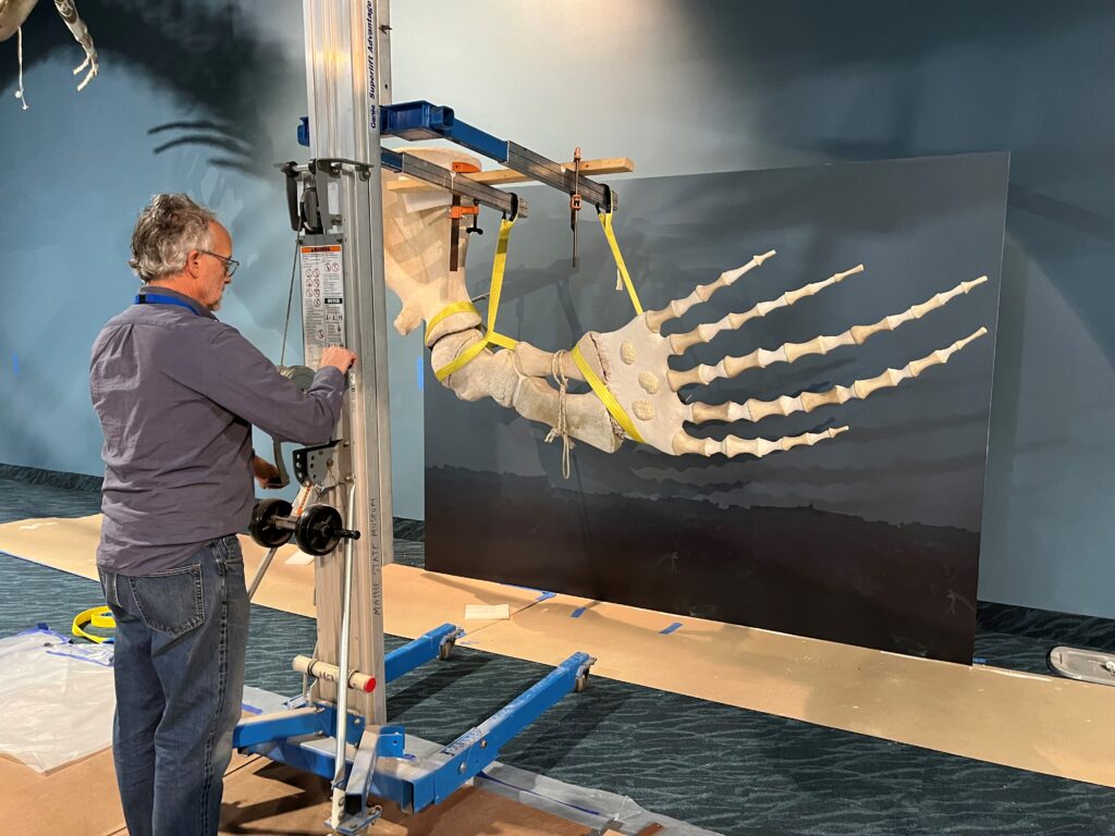 The Maine State Museum, following permitting processes from NOAA, was able to retain important bones from EgNo 3654, specifically a flipper and two 12-foot-long jawbones. All will be featured in the upcoming exhibition Vector: A Whale’s Life in the Gulf of Maine.