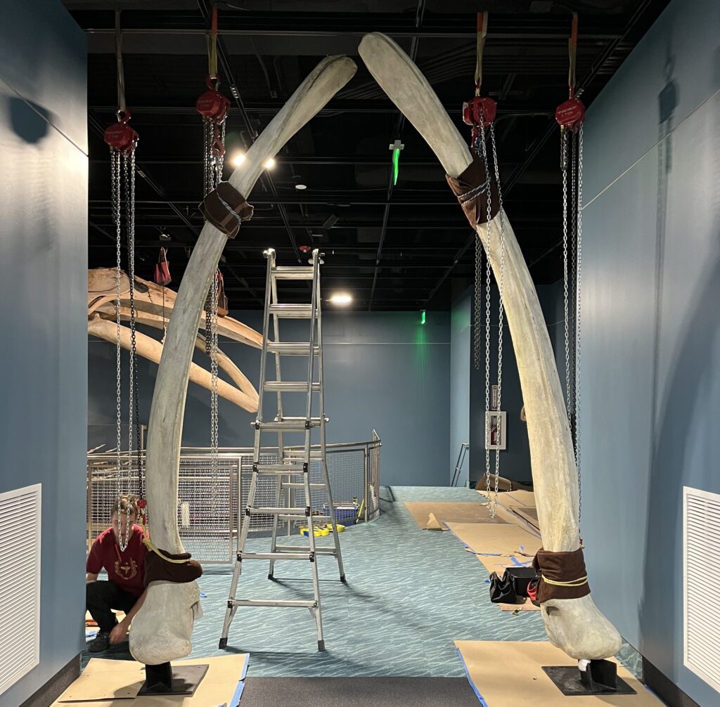 The selective representation of EgNo 3654’s bones is meant to add a new dimension to the whale gallery. EgNo 3654’s jawbones create a dramatic passthrough arch at the entrance to the exhibit. Additionally, an up-close look at her flipper bones, articulated by Whales and Nails and installed by museum staff, readily shows important shared characteristics between two species within the Mammalia class— whales and humans.